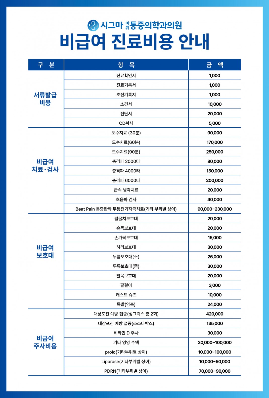 시그마통증의학과 비급여안내